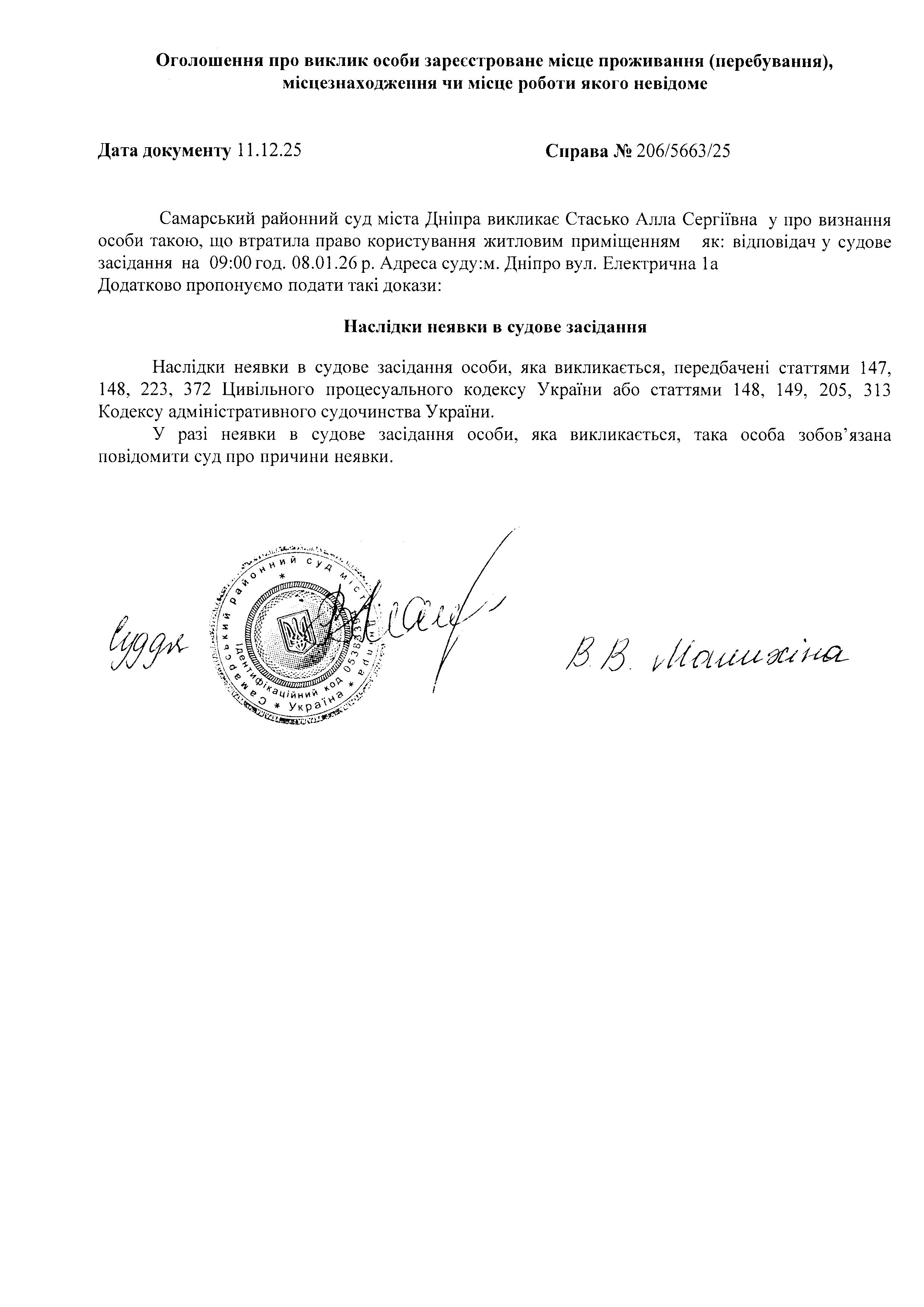 Оголошення про виклик Стасько А.С Справа № 206/5663/25
