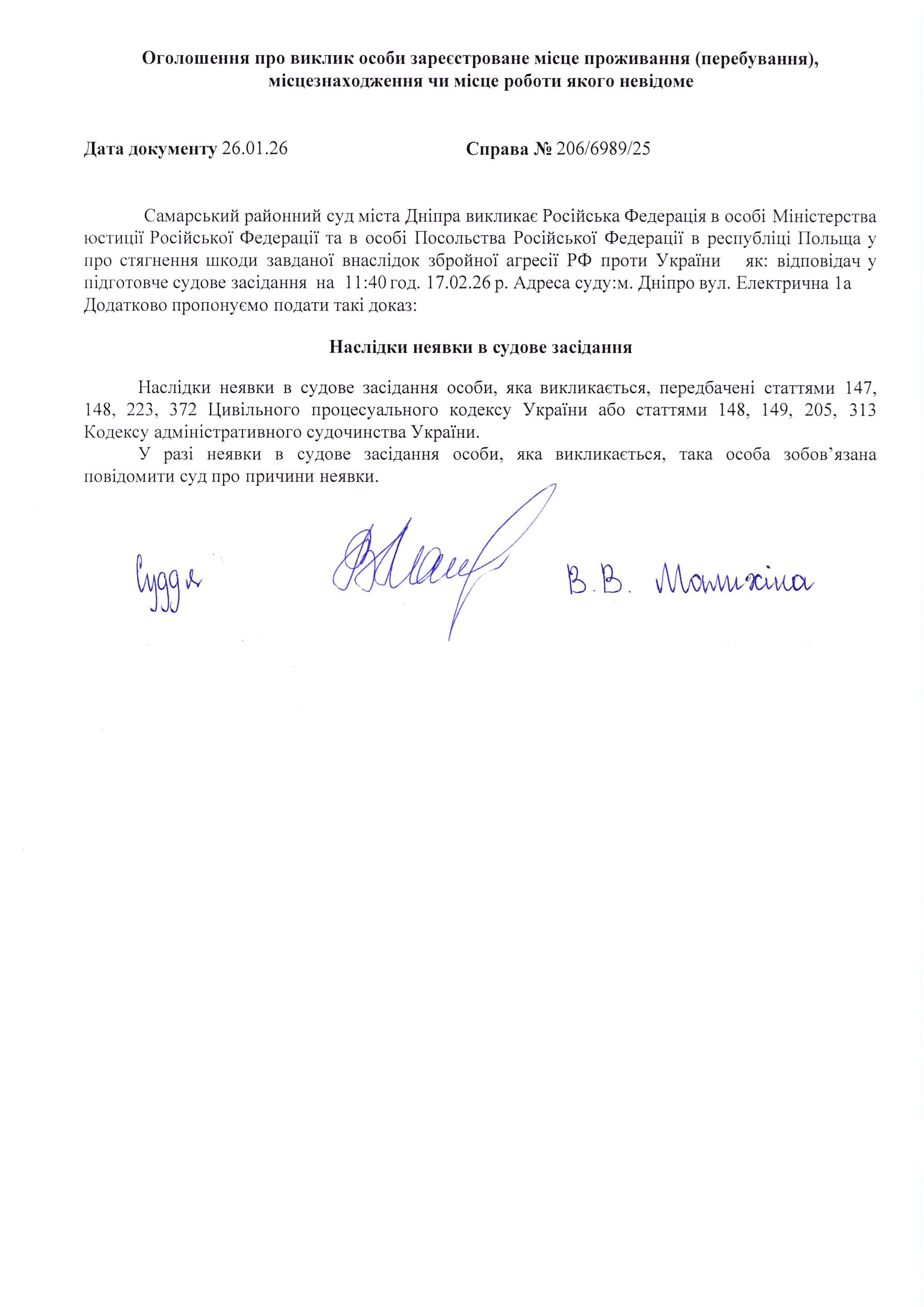 Оголошення про виклик Російської Федерації в особі Міністерства юстиції Російської Федерації Справа № 206/6989/25