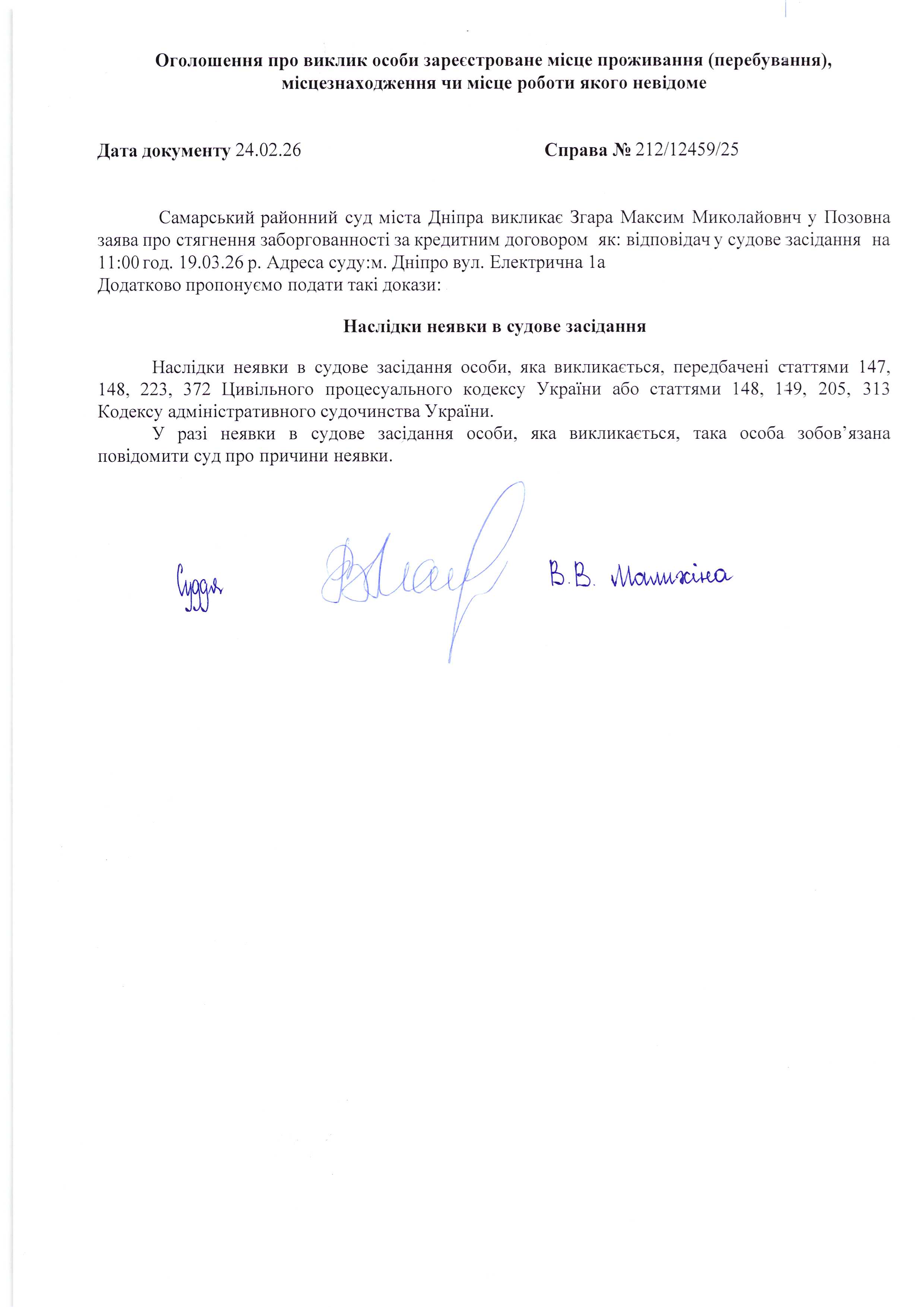 Оголошення про виклик Згара М М. Справа № 212/12459/25