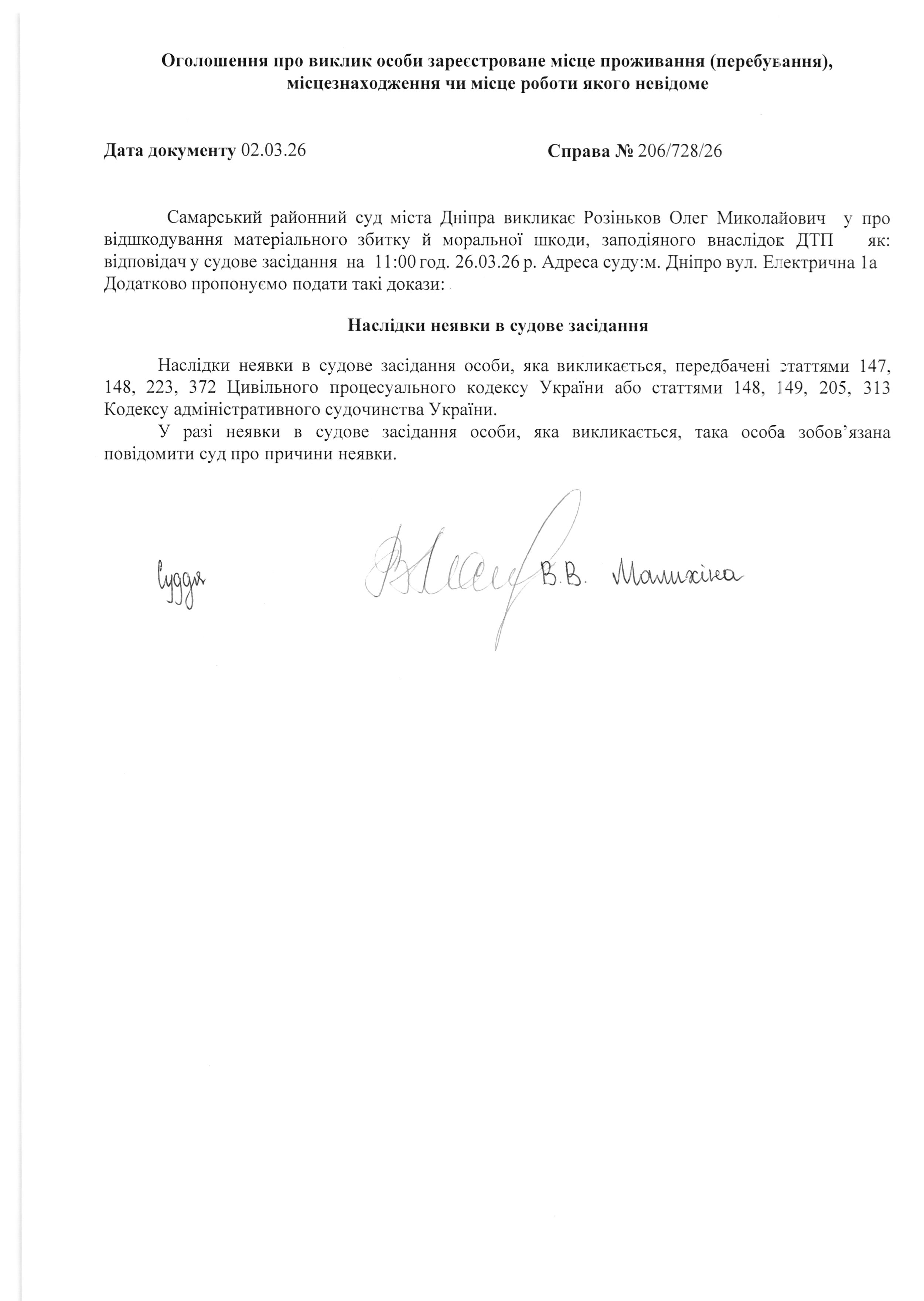 Оголошення про виклик Розіньков О. М. Справа №206/728/26