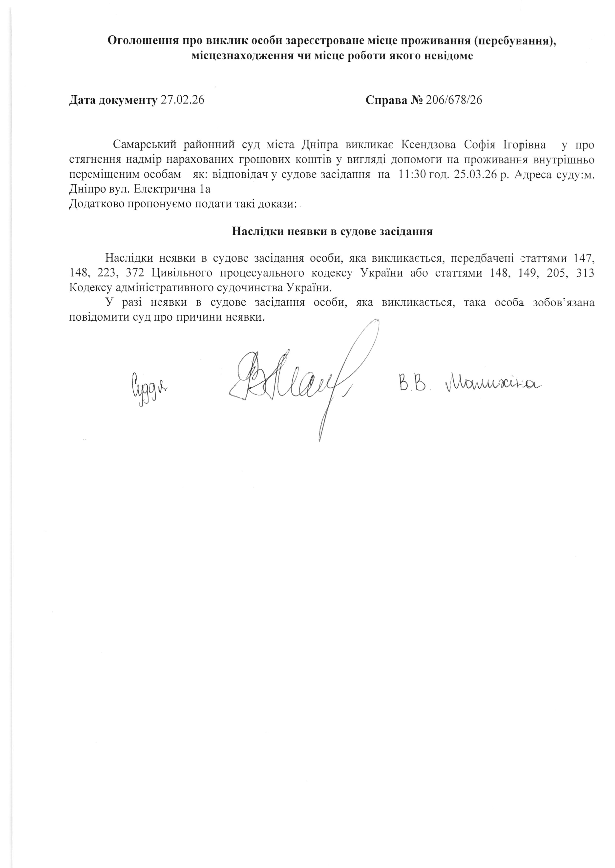 Оголошення про виклик Ксендзова С. І. Справа №206/678/26
