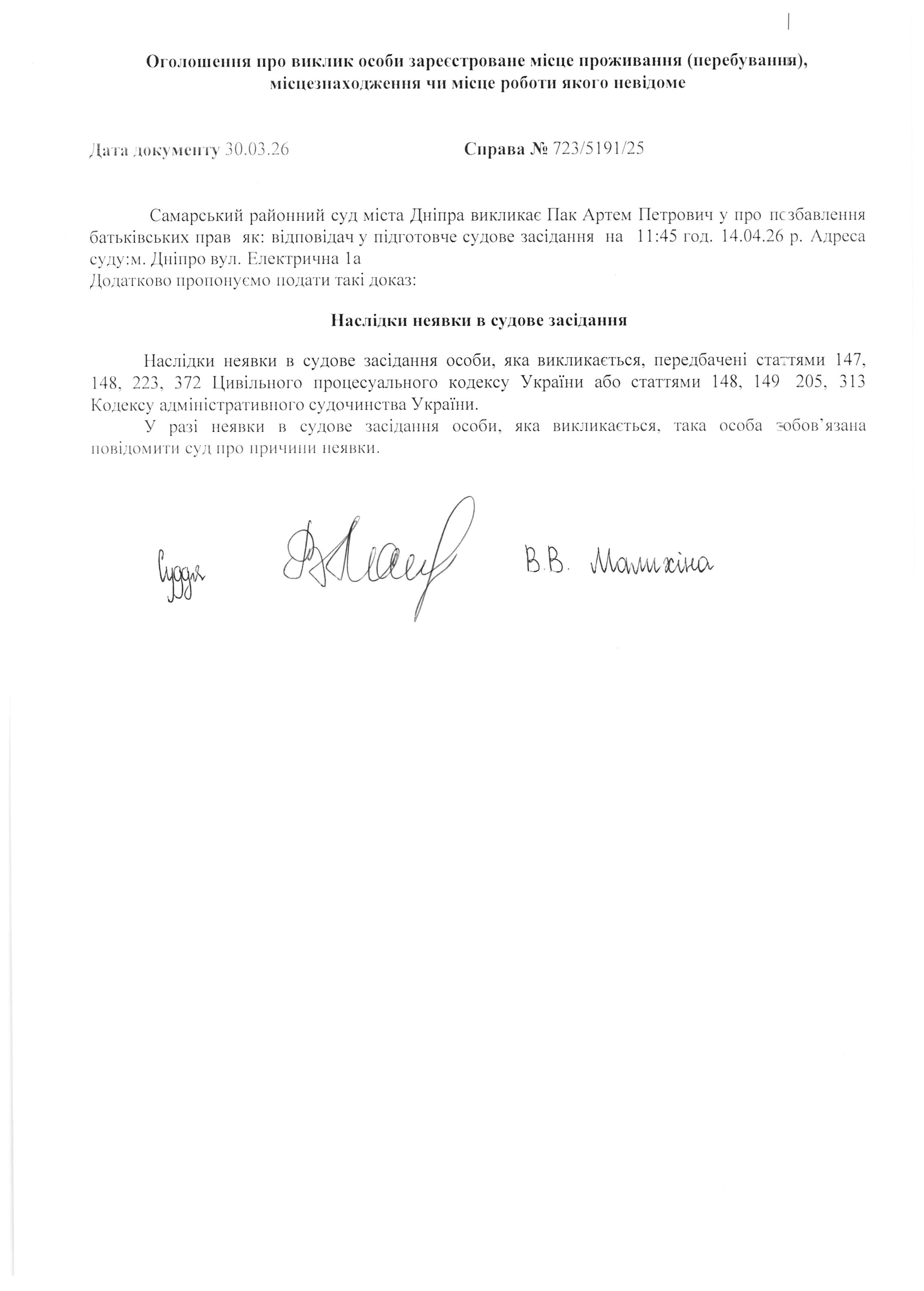 Оголошення про виклик Пак А.П. Справа №723/5191/25