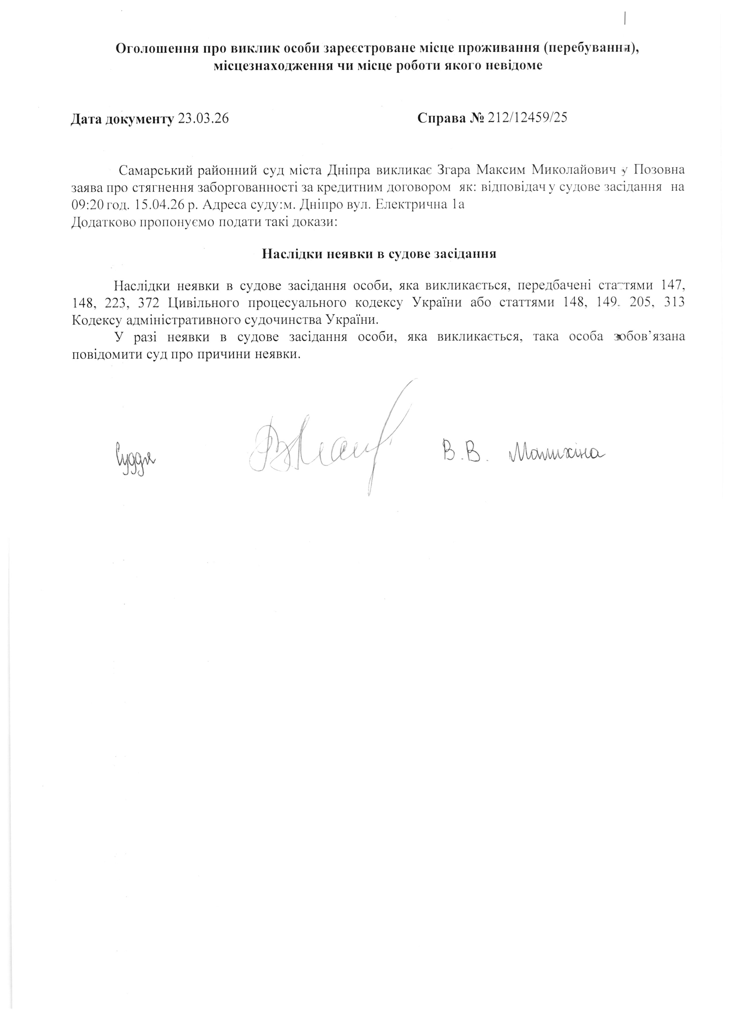 Оголошення про виклик Згара М.М. Справа №212/12459/25