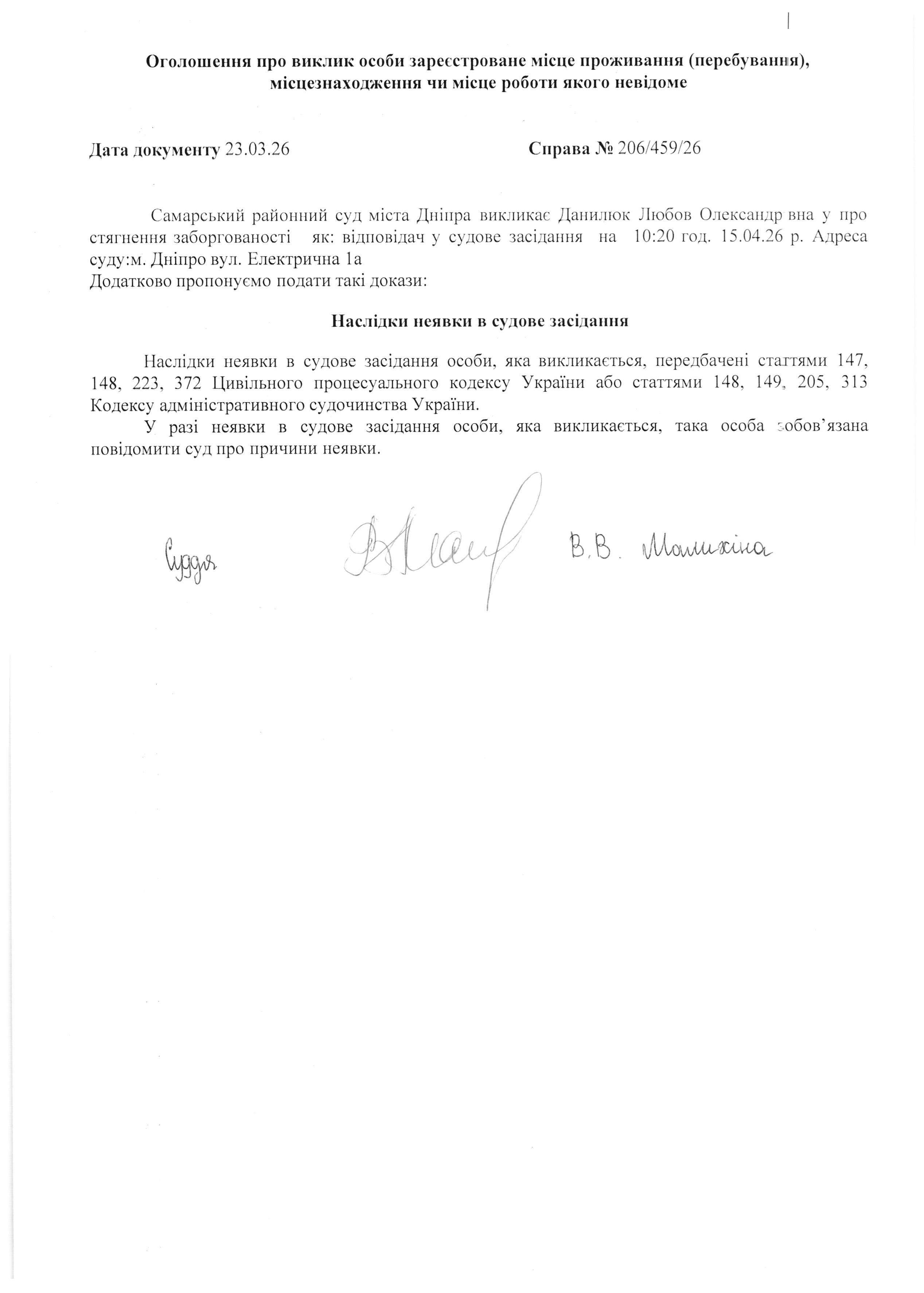 Оголошення про виклик Данилюк Л.О. Справа №206/459/26