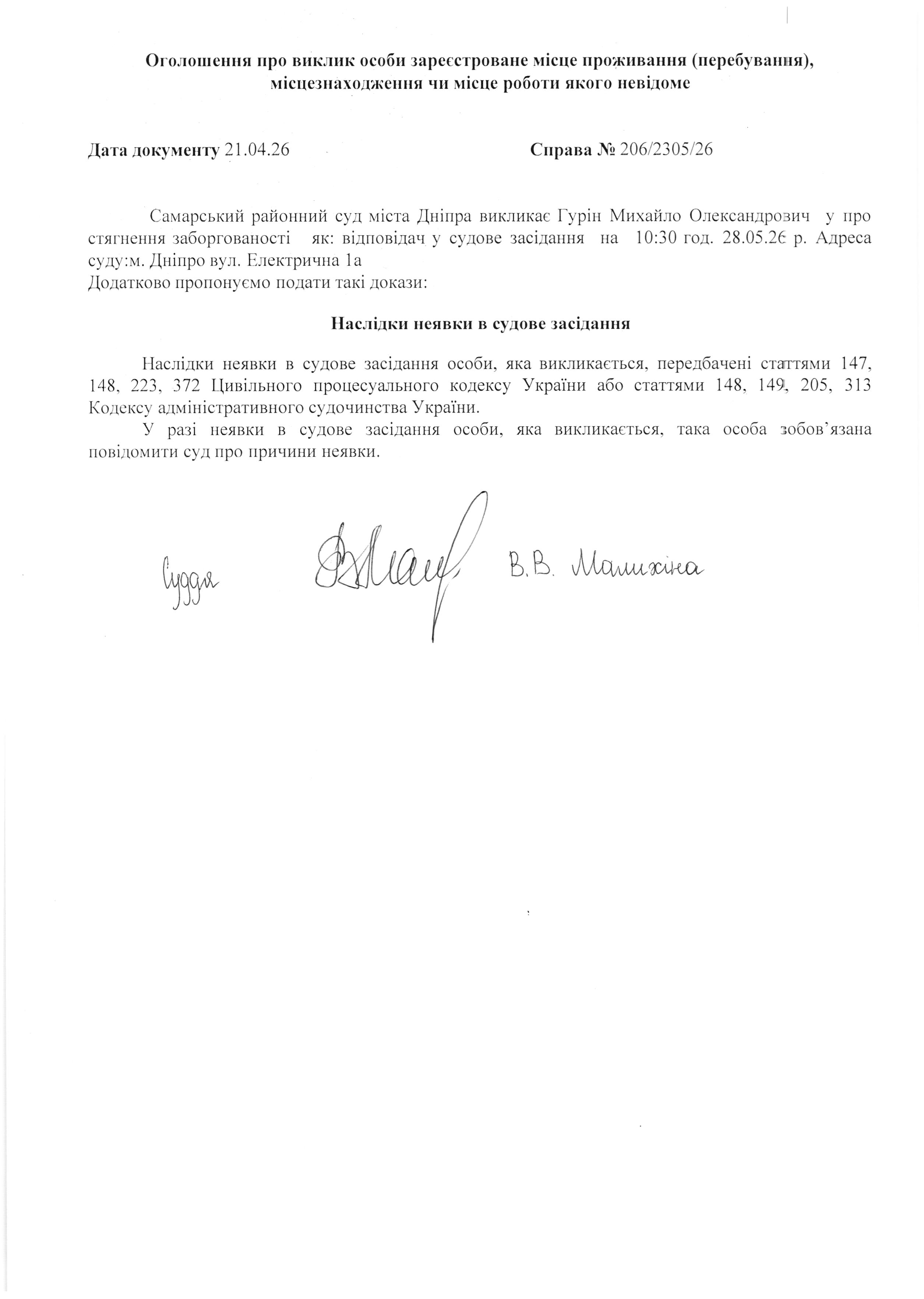 Оголошення про виклик Гурін М.О. Справа №206/2305/26