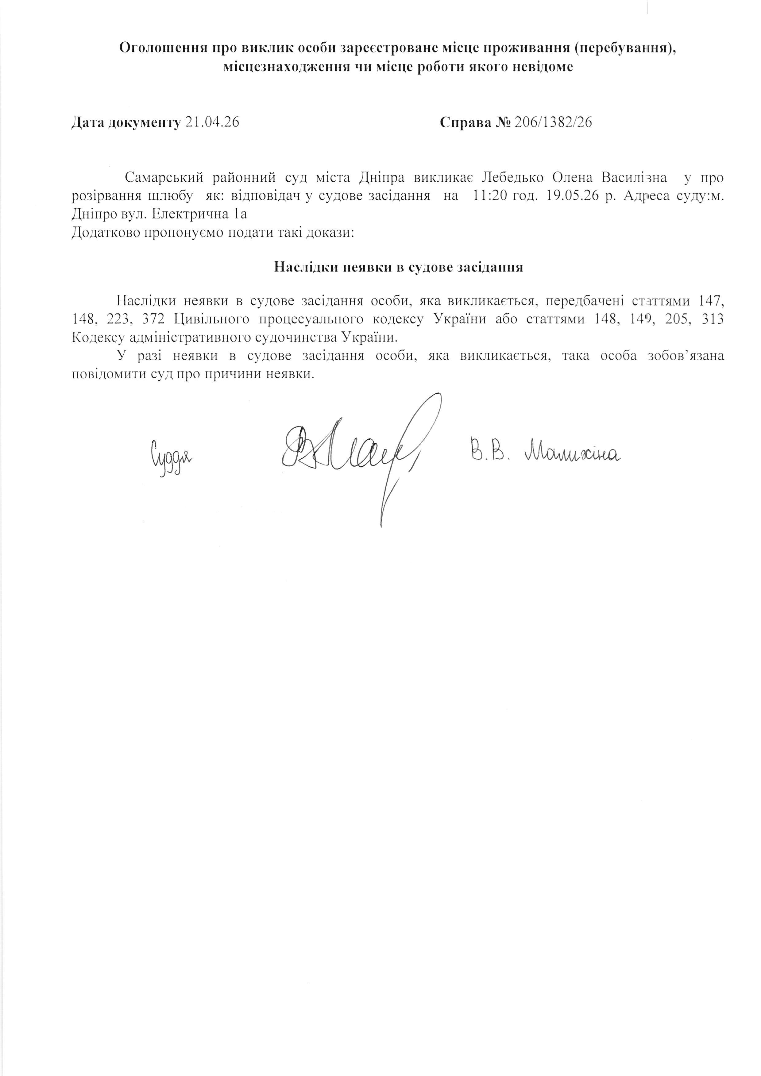 Оголошення про виклик Лебедько О.В. Справа №206/1382/26