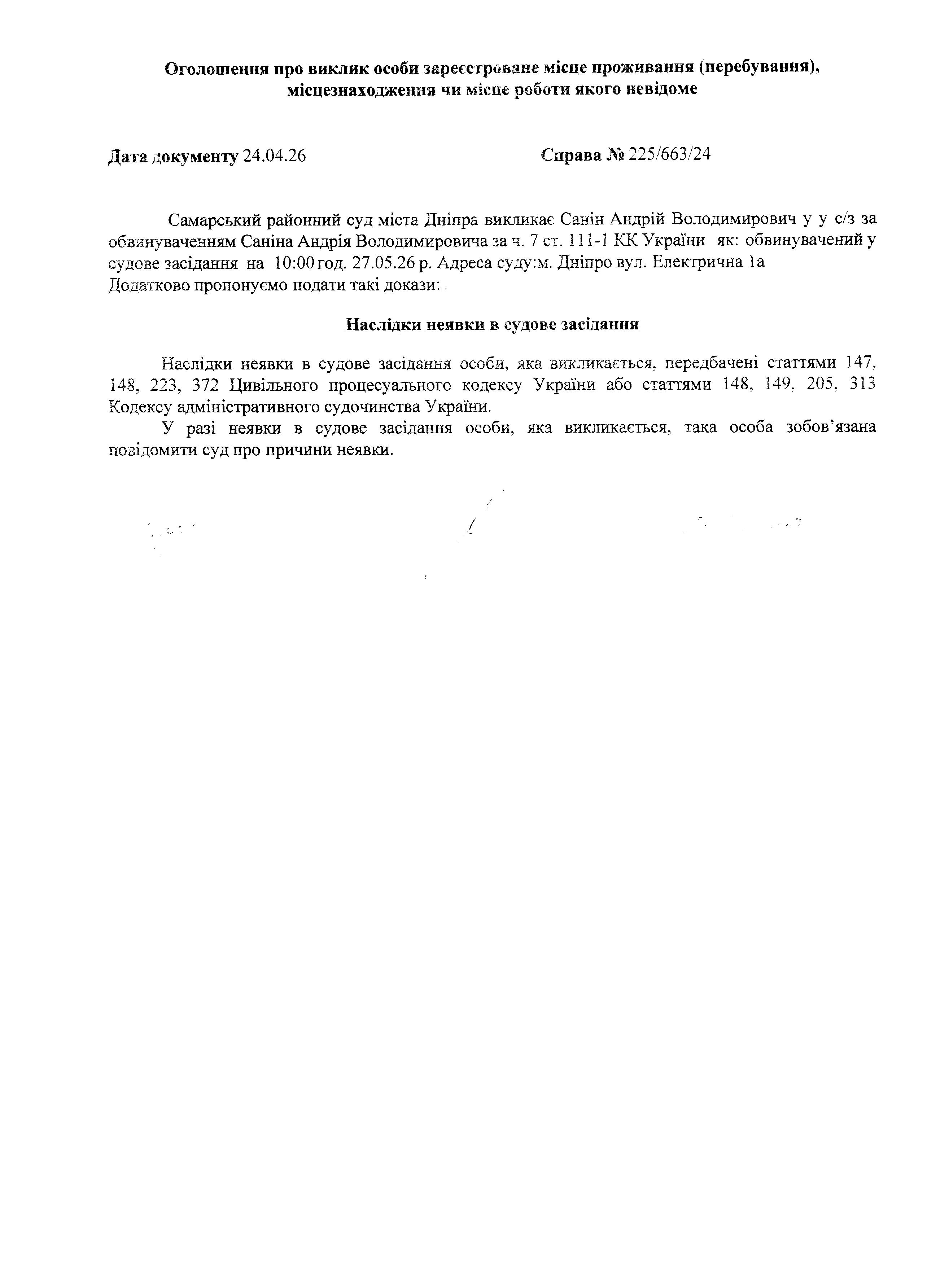 Оголошення про виклик Санін А.В. Справа №225/663/24