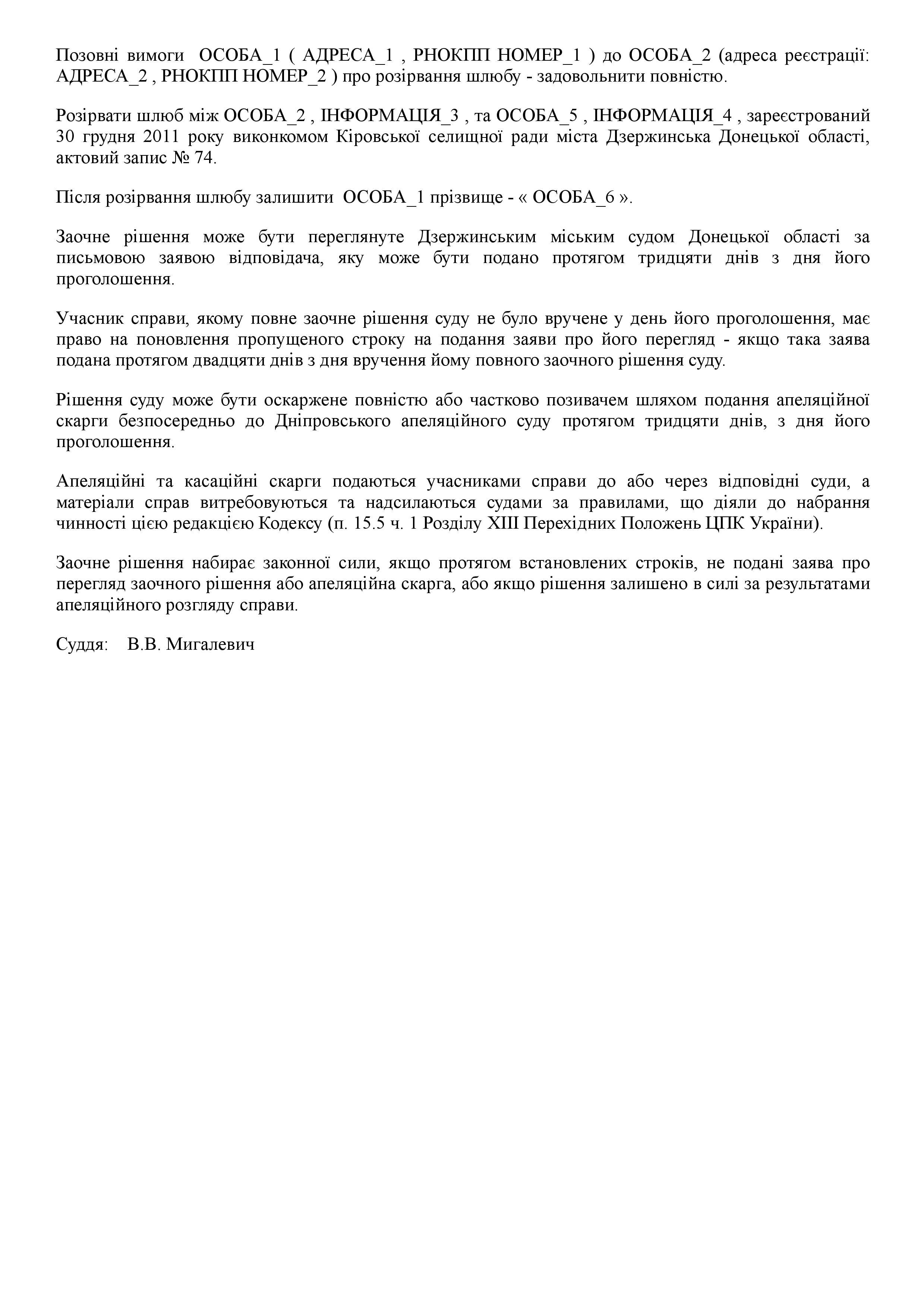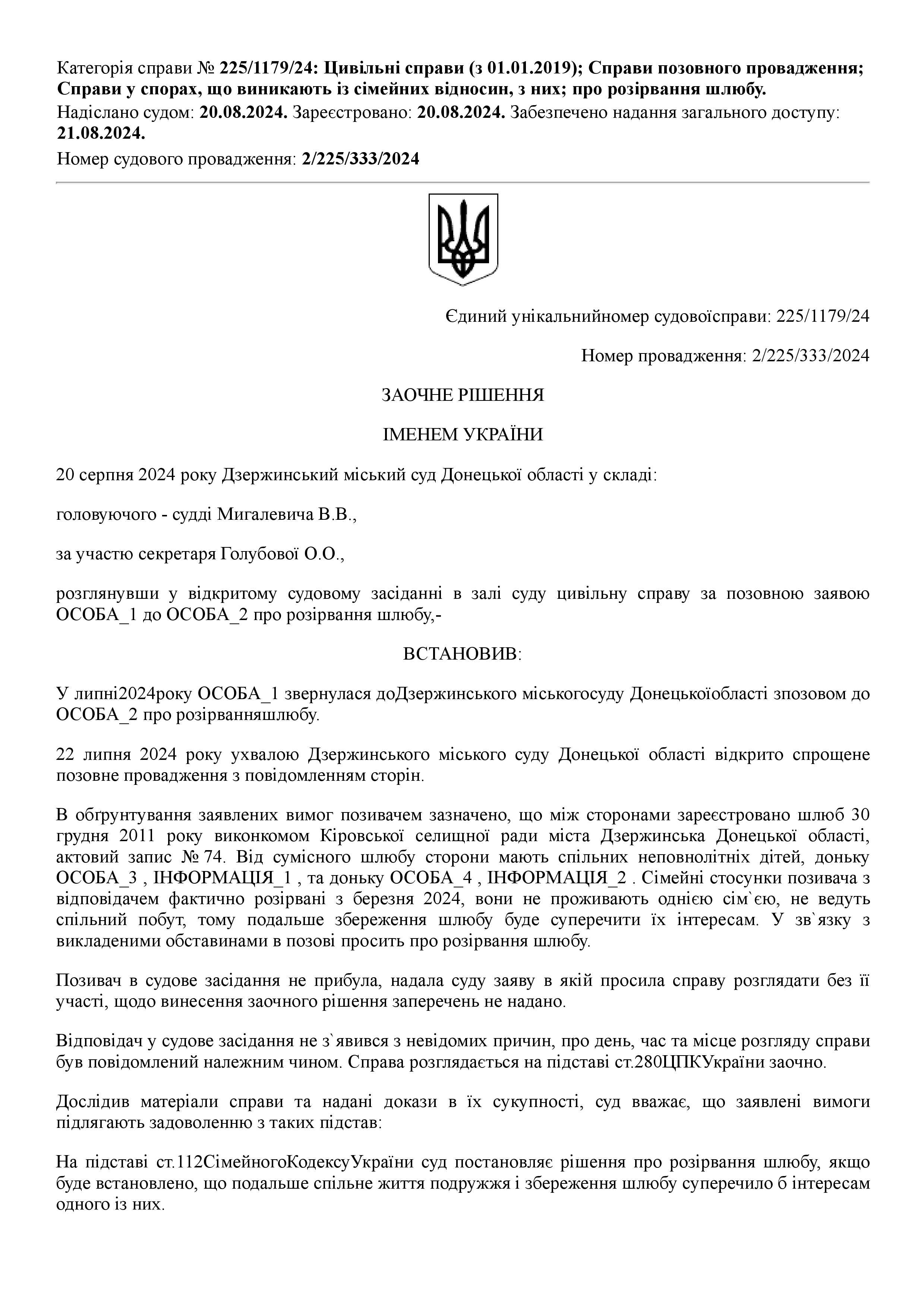 Рішення яке набрало законної сили Справа № 225/1179/24
